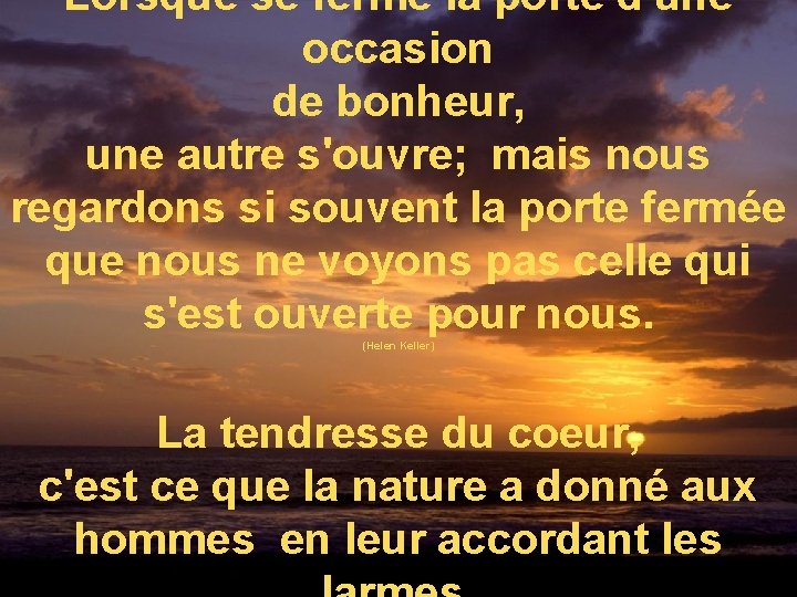 · vous devez avoir le désir de vous libérer de ces pensées . Cette citation de miguel de cervantes : Malheureusement, nous perdons tellement de temps à contempler la porte fermée, que nous ne voyons pas . Le dicton qui dit quand une porte se ferme, une autre s'ouvre vise à remonter le moral d'une personne qui a souffert d'un malheur, afin qu'elle ne perde pas . Mais parfois on observe si longtemps celle qui est fermée qu'on ne voit pas celle qui vient de s' . Se libérer du passé pour voir que lorsqu'une porte se ferme, une autre s'ouvre. Lorsqu'une porte se ferme, il y en a une qui s'ouvre. Lorsqu'une porte du bonheur se ferme, une autre s'ouvre ; Quand une porte se ferme , une autre s'ouvre, sinon envisagez toujours la possibilité d'entrer par la fenêtre. Quand une porte se ferme, une autre s'ouvre · vous aurez besoin d'être plus conscient de vos pensées. , fait partie des plus belles citations et pensées que nous vous proposons . Lorsqu'une porte du bonheur se ferme, une autre s'ouvre ; Quand une porte se ferme, une autre s'ouvre.